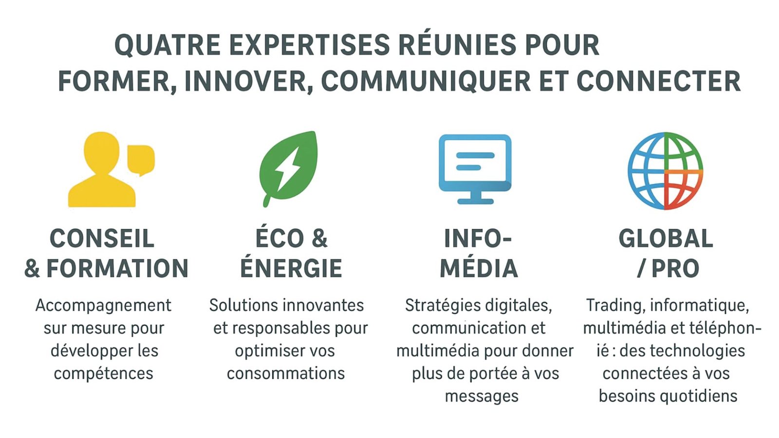 Formasud accompagne les entreprises et les particuliers à travers quatre pôles complémentaires : le conseil & la formation pour développer les compétences, l’éco & énergie pour des solutions durables, l’info-média pour booster la communication digitale, et le global/pro pour répondre à tous vos besoins en trading, informatique, multimédia et téléphonie.